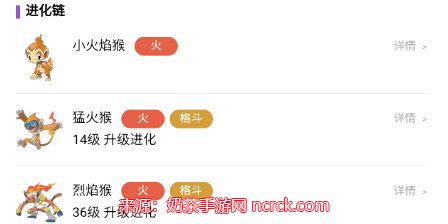 4. 进化链:小火焰猴 → 猛火猴 (14级升级) → 烈焰猴 (36级升级)