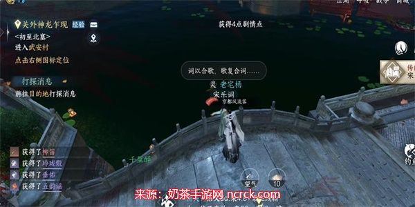 6、继续循线索,前往桥上。在那里,用你的嗓音吟唱出宋乐词所创作的曲子,你将会看到一个奇妙的场景,并最终获取柳笛这一宝贵的物品。