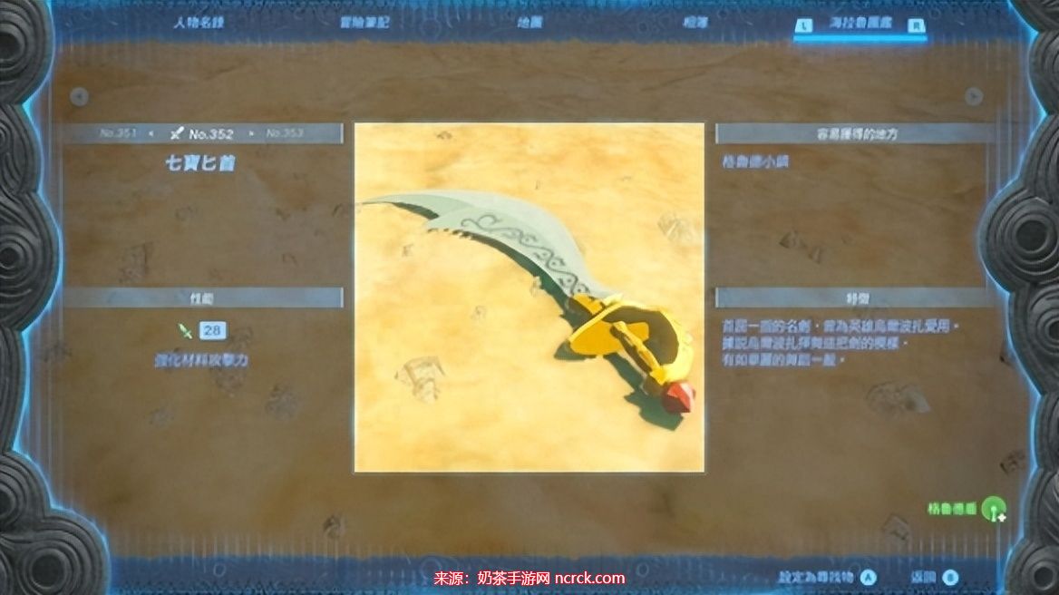 作为单手武器,七宝匕首可以一边举剑一边举盾,操作简便,适用于各种情况。无论是在探索还是在战斗中,它都能轻松应对各种挑战。如果七宝匕首损坏,你可以找到NPC制造一把新的,或者修复已有的。修复方法非常简单,只需将其附加到任何武器上,然后将武器交给火山章鱼,最后前往一始村敲开它,你就会拥有一把崭新的七宝匕首。