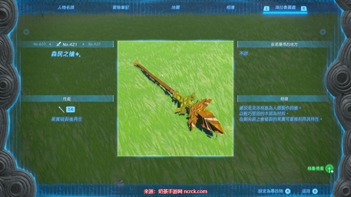 接下来,让我们来介绍第三把强力武器,尽管看似攻击力不高的森民之枪。森民之枪是由克洛格族制造的枪,其特点在于剑尖的素材能够反复使用。最强大的组合是将森民之枪与烟雾蘑菇搭配使用。只需轻轻戳一下,敌人就会迷失方向,然后你可以大摇大摆地走到敌人背后,发动突袭。这把武器无疑是绝佳的偷袭工具。
