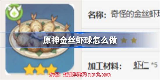 金丝虾球,作为原神中的烹饪佳肴,不仅美味可口,还能为旅行者提供生命值的恢复,根据烹饪的熟练度,可以得到三种不同效果的金丝虾球,小编希望每位旅行者都能体验到烹饪的乐趣,并在旅途中得到食物的滋补,想要了解更多相关攻略的小伙伴可以持续关注奶茶手游网,奶茶手游网每天会为大家推送最新最全的攻略,一定不要错过哦!