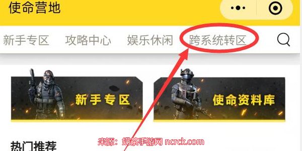 3、微信区玩家需要在微信中搜索【使命召唤手游社区】小程序,进入后点击右上角的【跨系统转区】,操作流程和Q区一致。