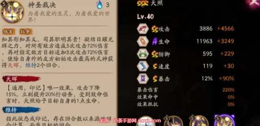 在天照大神的面板属性上,防御和攻击均达到了SS级别,综合能力极为出色。