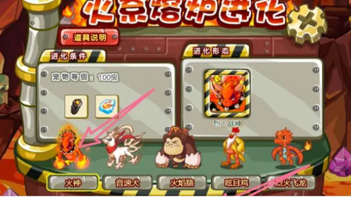 6、进入进化界面之后我们在其中找到想要进化的宠物头像,这里只有火属性的进化