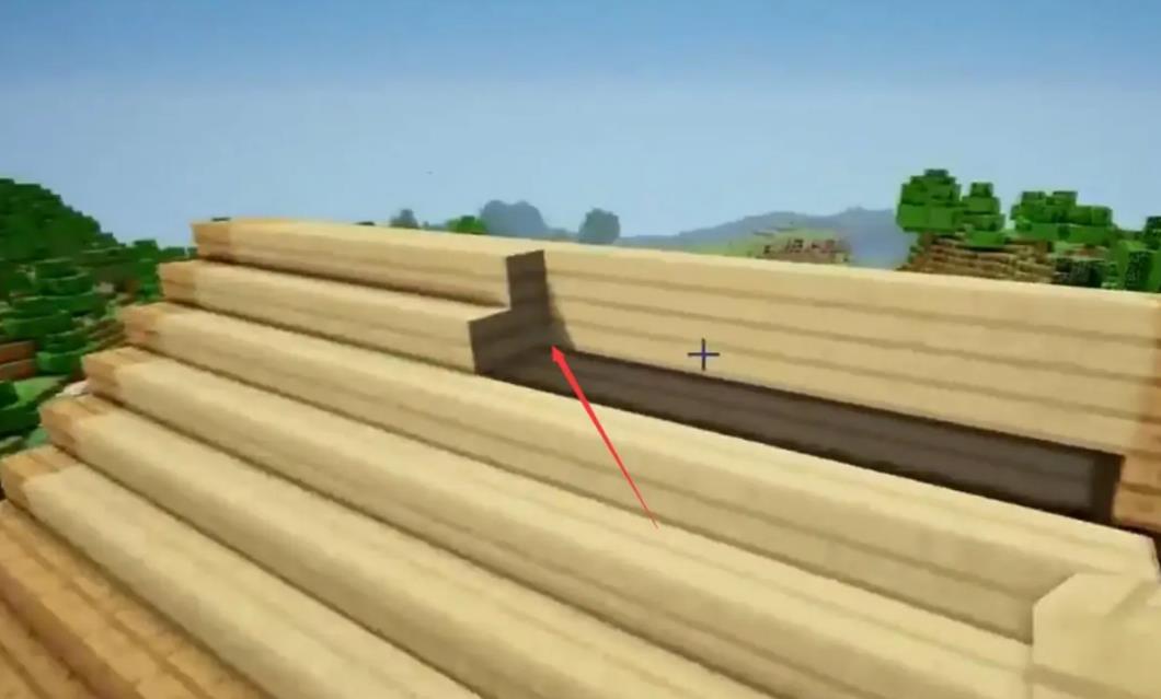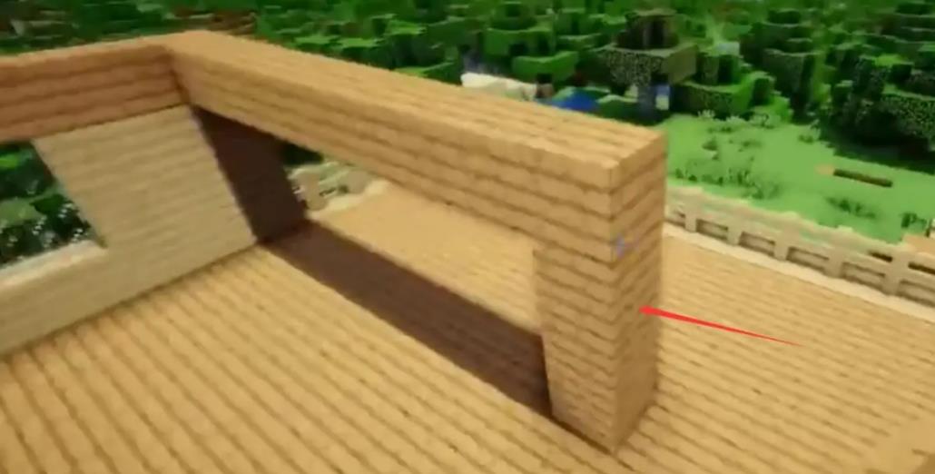 1、进入我的世界游戏中,首先用实木方块做好第一层框架。