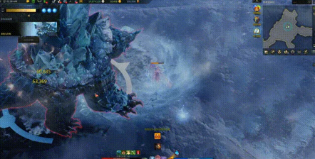 冰龟右脚左脚接连抬起,有点像相扑的动作,然后跳起砸击地面,生成冰花形状的冰爆。接着会再跳一次,生成更大范围的冰爆。我们可以提前躲在BOSS头和前肢的中间躲避。