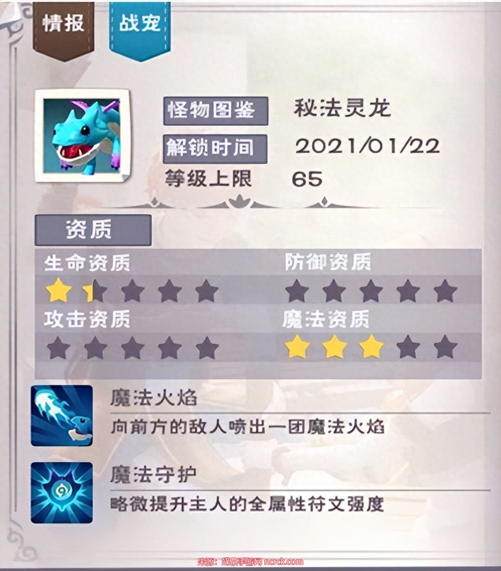秘法灵龙的资质相当不俗,生命资质为2.9,魔法攻击资质为1.5,防御资质为0。初始资质方面,生命为67,攻击为10,魔法攻击为12。这表明秘法灵龙在魔法伤害方面表现出色,相比于普通怪魔法灵龙,它拥有额外的技能,并且召唤后全符文强度提升10。虽然在伤害上不如利刃云鹰,但其技能“魔法守护”对于提升全属性符文强度非常有价值,因此值得培养。