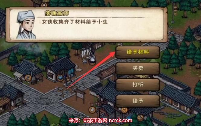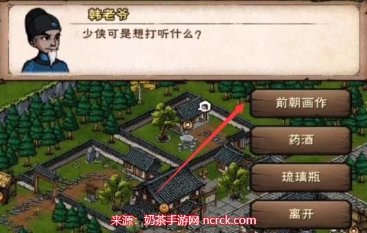 1、在双王镇的茶摊位置,找老板打听韩老爷买的那幅图的消息。找到韩老爷对话,并买下那幅《将军夜宴图》。