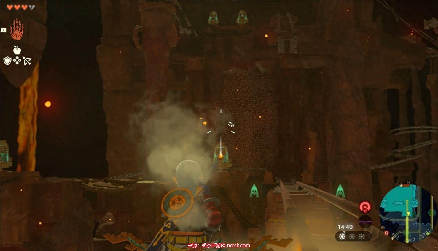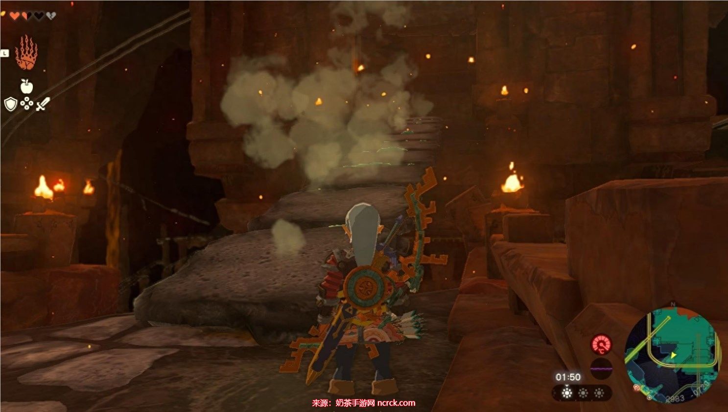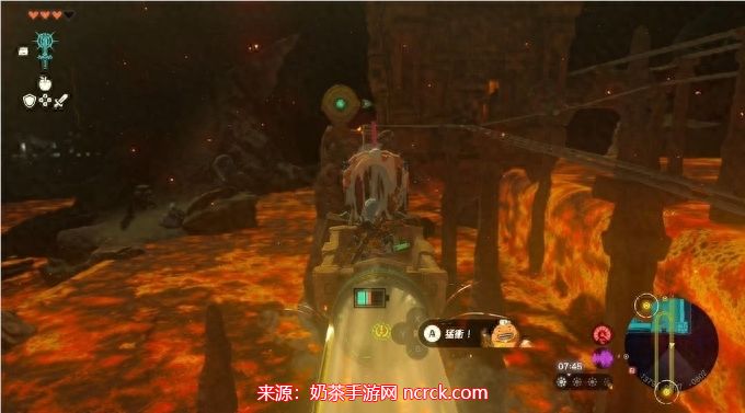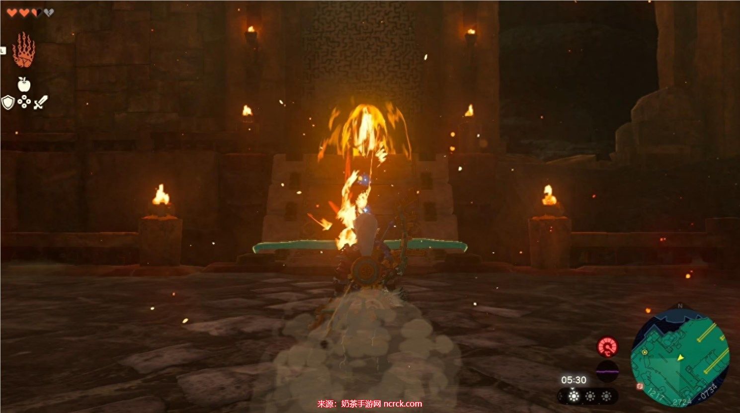 在轨道上行驶的过程中,阿沅会跑到矿车前方。你可以按A键将阿沅发射出去,然后使用A键操控阿沅撞击圆形装置,以改变铁轨的行进方向,这样才能到达下一个目的地。到达底部后,不要急着前进。下车,来到左边,携带一个放水栓,并朝深处前进,来到岩浆旁边。制作石头路并使用阿沅撞击挡路的石头,以继续前进。之后,走到底,你就能找到第一个铜锣了。铜锣也就是火之神庙的钥锁形式,用阿沅的能力撞击它并解锁,后面的步骤就不再赘述。